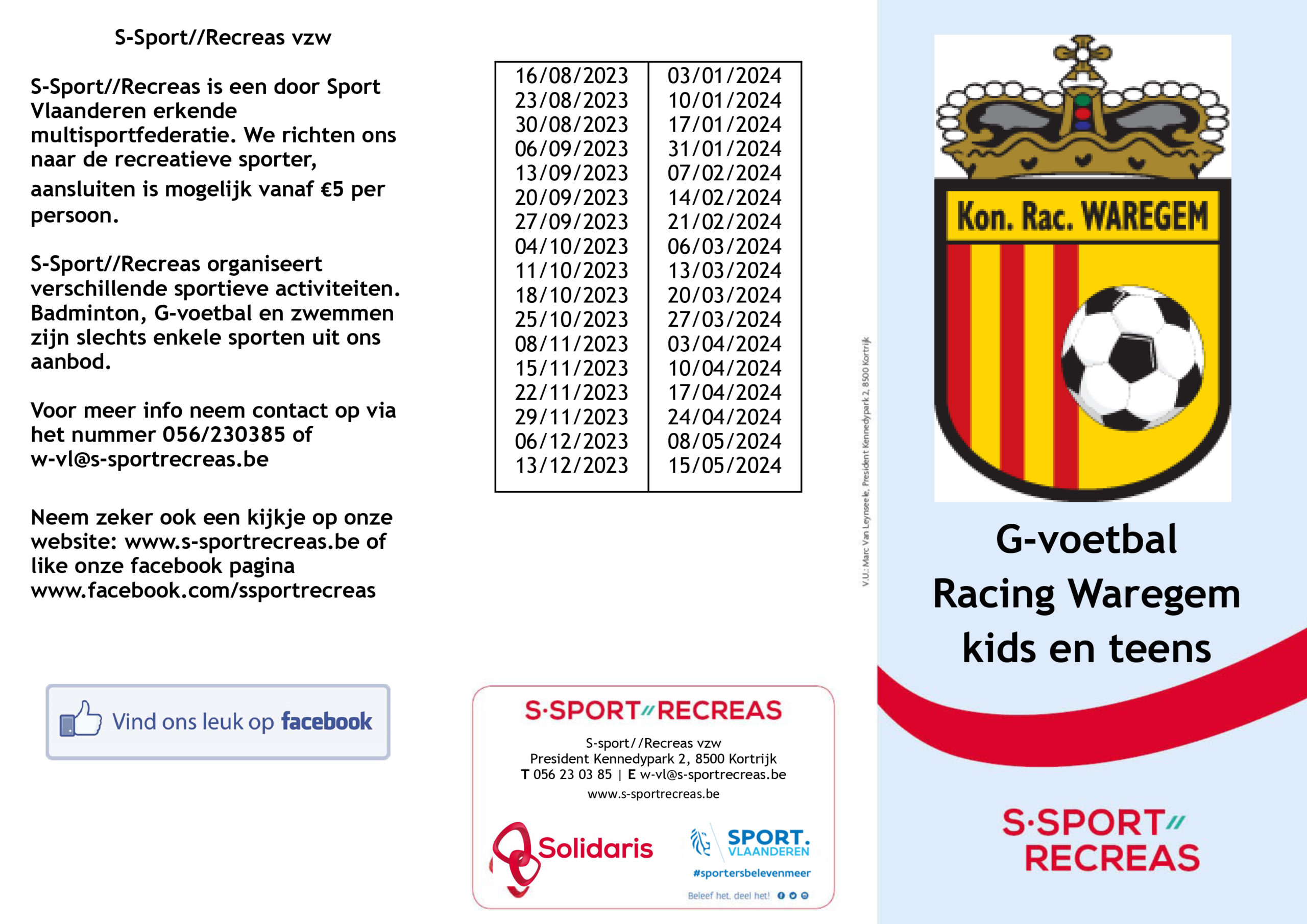 S-Sport//Recreas vzw S-Sport//Recreas is een door Sport Vlaanderen erkende multisportfederatie. We richten ons naar de recreatieve sporter, aansluiten is mogelijk vanaf €5 per persoon. S-Sport//Recreas organiseert verschillende sportieve activiteiten. Badminton, G-voetbal en zwemmen zijn slechts enkele sporten uit ons aanbod. Voor meer info neem contact op via het nummer 056/230385 of w-vl@s-sportrecreas.be Neem zeker ook…