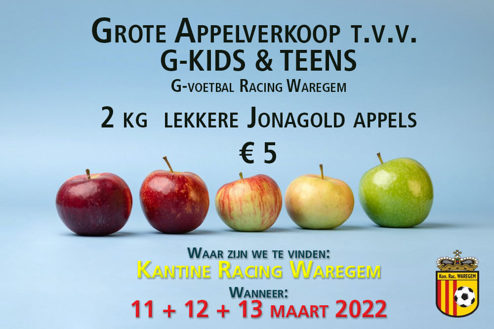 Steun onze spelertjes en koop lekkere sappige appeltjes! 2 KG LEKKERE JONAGOLD APPELS VOOR 5 € Bestellen kan via deze link: https://forms.gle/xdg8kumG6qvTgBED6 De appels kunnen afgehaald worden in de kantine van Racing Waregem. Wanneer : in het weekend van 11, 12 en 13 maart 2022. (grote bestellingen kunnen eventueel aan huis geleverd worden)